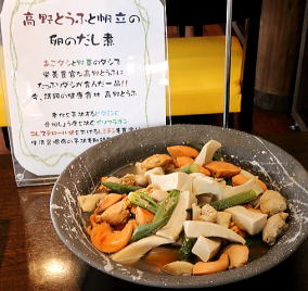 | 先月より追加した新メニューが好評です。 青森県の進める「できるだし」を使った減塩「だし活」料理は塩味を抑えながらも出汁の旨味で美味しく頂けるよう工夫しました。 |